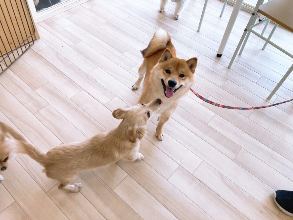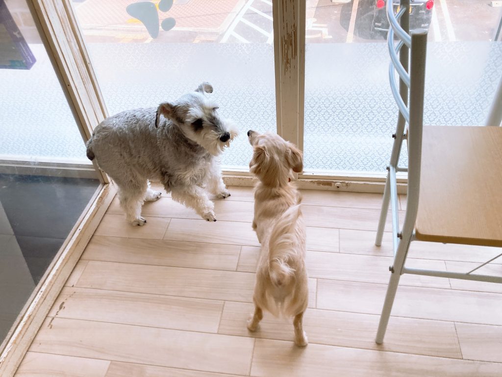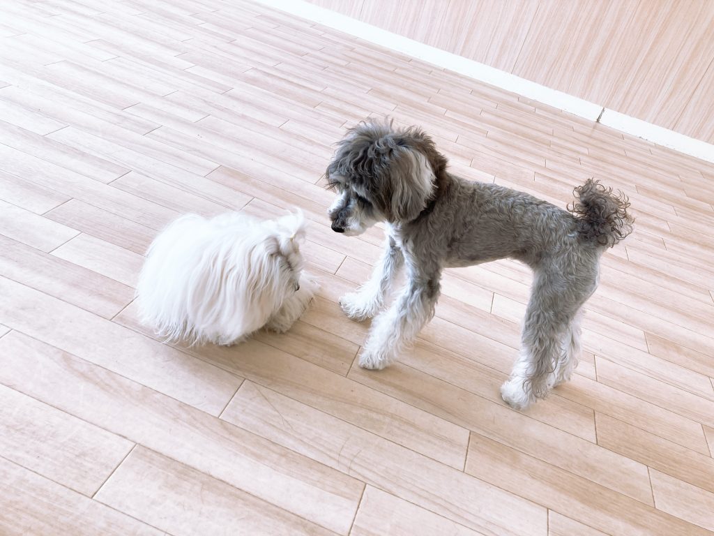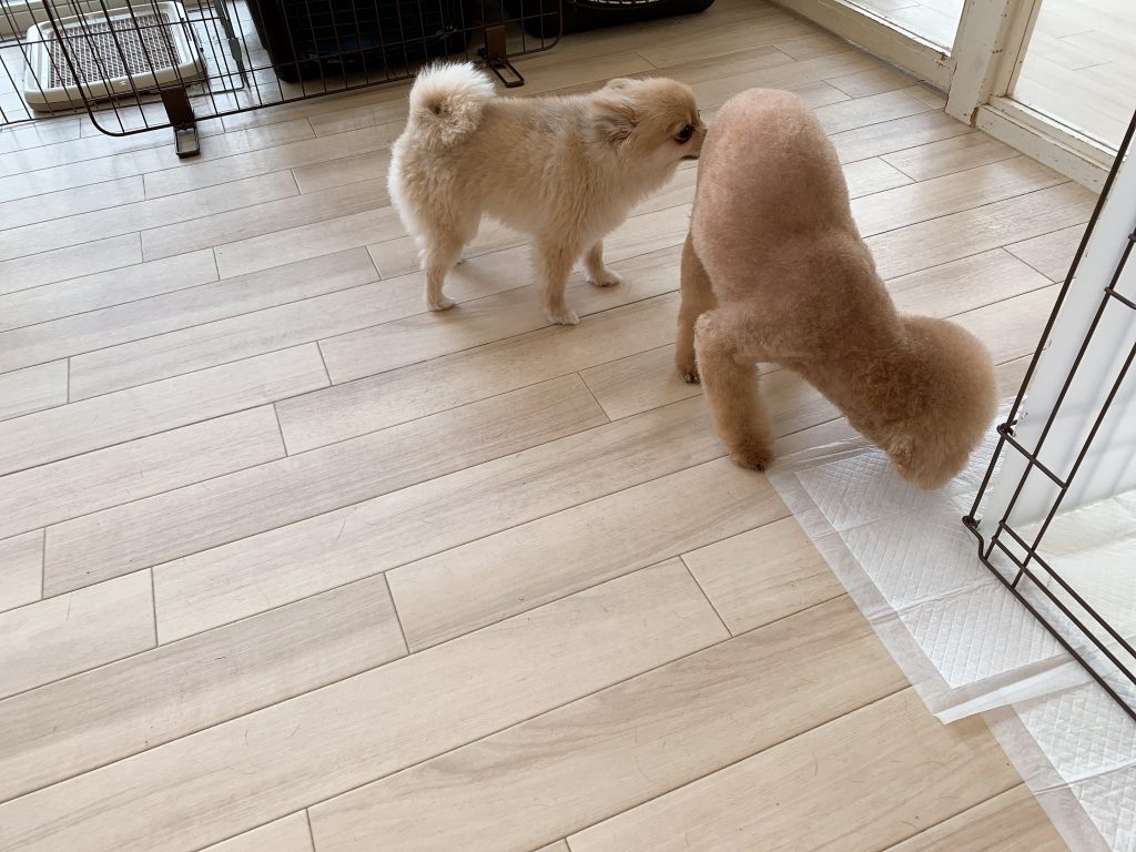 トリミングをしてとっても素敵になったみるくちゃんと、いい香りがする☆と興味津々のマロちゃん!
