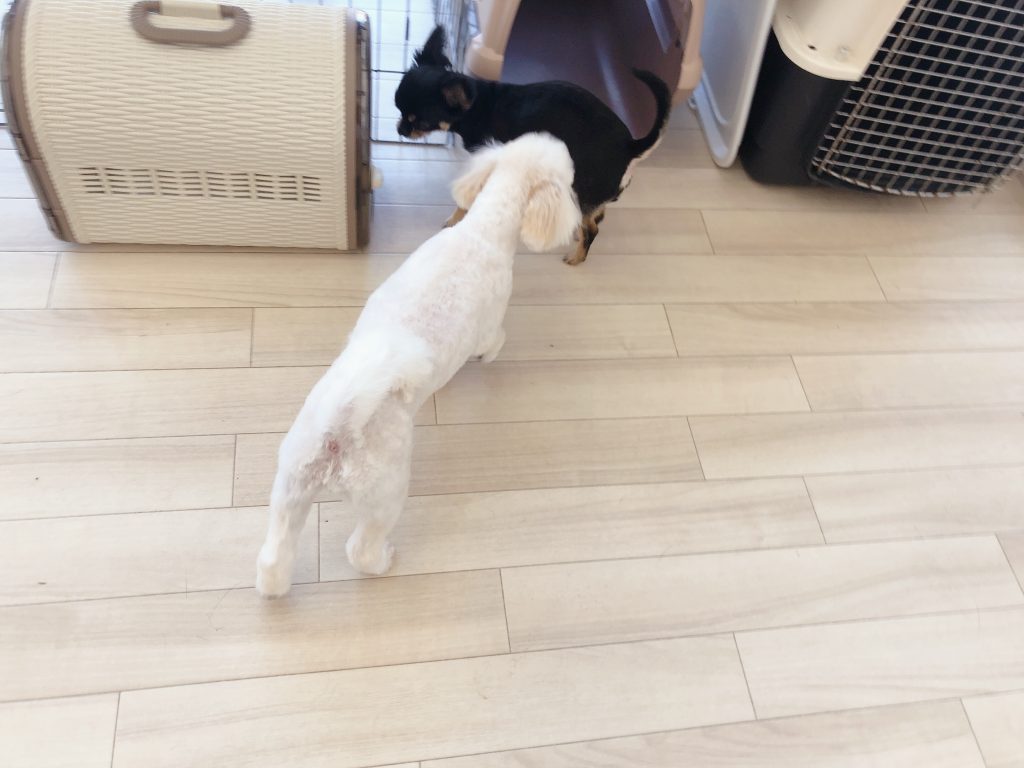 トリミングが終わりとっても素敵になったコロちゃんの所へルビーちゃんがやって来ましたよ☆